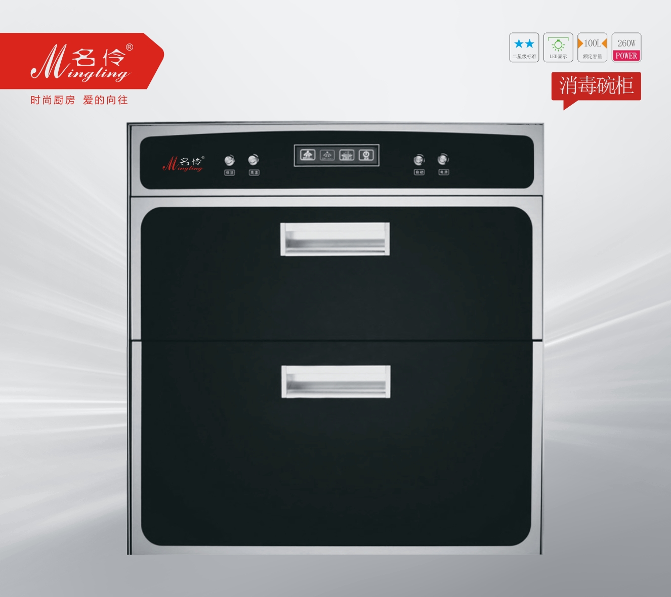 1、多重性温点控制,实现模糊逻辑概念新主张。 2、内置双抽,空间充分利用,专利不锈钢内置导轨。 3、高档不锈钢材质和黑色面板完美结合,隐藏式拉手设计。 4、双管三模,杀菌无死角,高效更专业,快速杀灭20余种常见病菌。 5、PTC热循环系统,均匀烘干并加速臭氧分解。 6、面板材质:不锈钢+钢化玻璃,控制开关:按键彩屏显示。